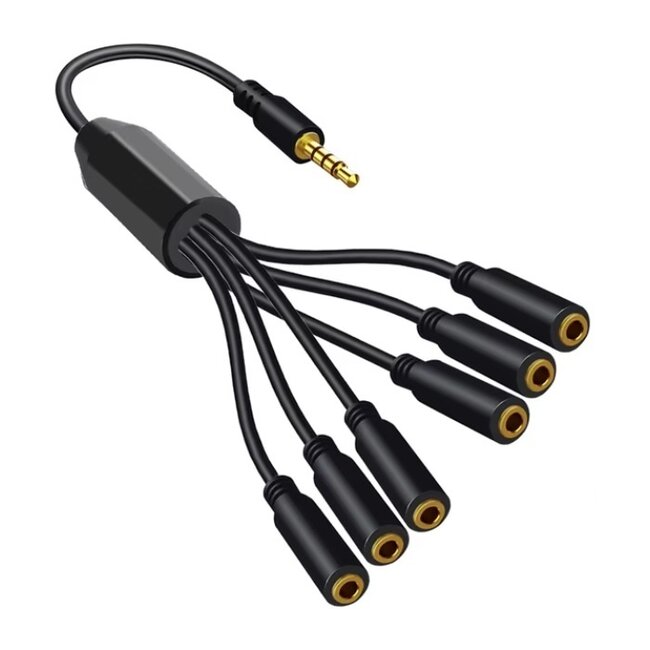 Verwenden Sie diesen Splitter, um einen Mini-Jack-Anschluss aufzuteilen. So können Sie 6 Geräte, zum Beispiel Lautsprecher und/oder Kopfhörer, mit dem 3,5-mm-Klinkenausgang Ihres (tragbaren) Geräts verbinden.