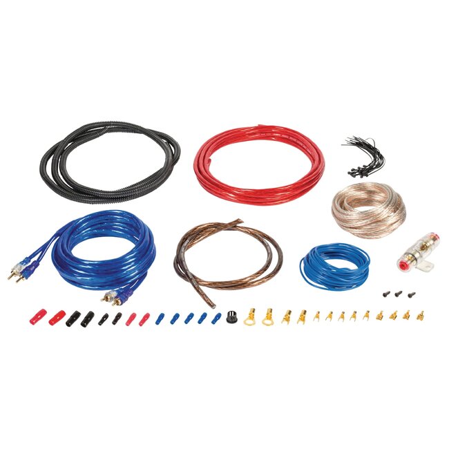 Umfangreiches Set mit hochwertigen Kabeln, Sicherungen und mehr. Alles, was Sie benötigen, um Ihr Autoradio und Ihren Verstärker anzuschließen.