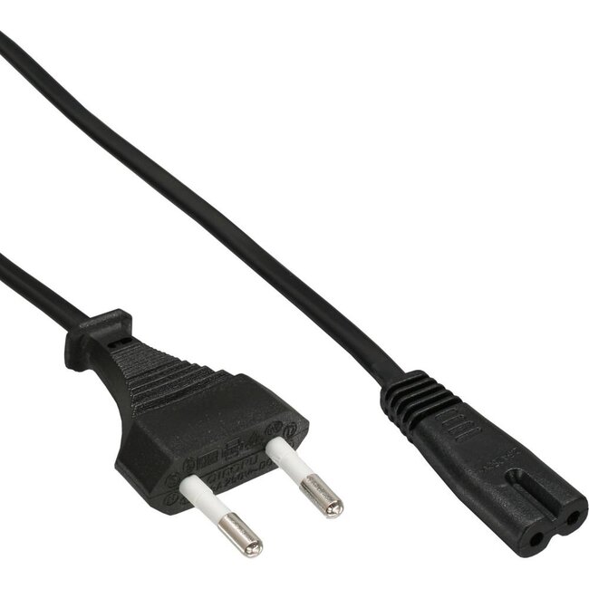 Verwenden Sie dieses ungeerdete Netzkabel für Audio-, Video- und Computer(peripherie)geräte mit 2-poligem Anschluss. Dieser 2-polige Anschluss wird auch als „Euro“- oder „8-förmiger Stecker“ bezeichnet. Dieses Stromkabel eignet sich für viele verschiedene elektronische Geräte, darunter Haushaltsgeräte und Pflegegeräte sowie (Zubehör und Peripheriegeräte von) Computern und Audio- und Videogeräten.