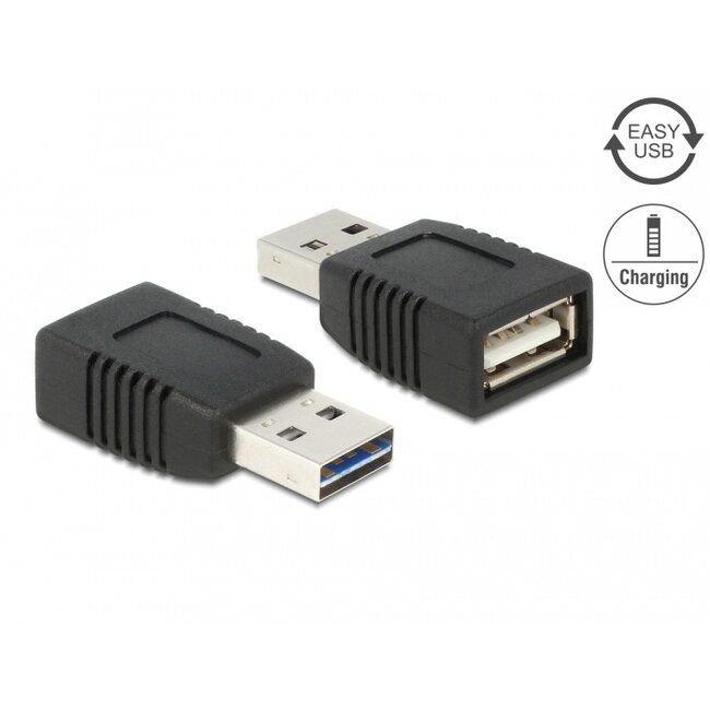 Dieser Adapter von Delock mit EASY-USB-Stecker kann beidseitig in den USB-A-Buchsenanschluss eingesteckt werden. Dadurch ist der Stecker von beiden Seiten nutzbar und erleichtert das Einstecken. Die Datenleitungen sind nicht verbunden, sodass der Adapter ausschließlich zum Laden verwendet werden kann. Das bedeutet, dass ein PC keinen Zugriff auf die Daten eines z. B. angeschlossenen Smartphones hat.