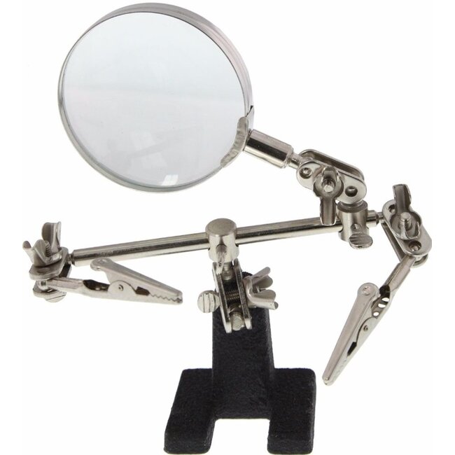 Ideales Hilfsmittel, das Ihnen beim Löten hilft. Dank der Klemmen können Sie bequem löten, und das Vergrößerungsglas macht diese dritte Hand auch für feine, präzise Arbeiten geeignet. Mit schwerem Stativ.