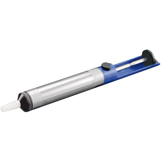 Mit dieser Entlötpumpe können Sie flüssiges Lot absaugen. Sie eignet sich, um fehlerhafte Lötstellen zu entfernen, aber auch zum Demontieren von Chips oder anderen Bauteilen. Die Entlötpumpe verfügt über eine Spitze mit Teflonbeschichtung und ein leichtes Metallgehäuse. Die Spitze ist austauschbar.