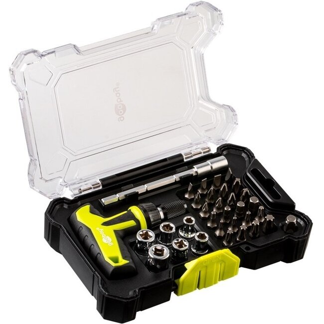 - Set enthält 24 Bits, 6 Steckschlüssel, 1 Bit-Verlängerung, 1 Steckadapter, 1 T-Ratschen-Schraubendreher und eine Aufbewahrungsbox