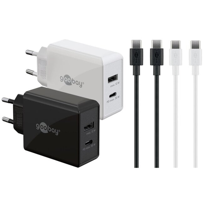 Verwenden Sie dieses universelle USB-Ladegerät-Set, um Ihre tragbaren Geräte über die USB Typ-C Anschlüsse aufzuladen.