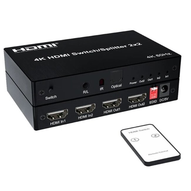 Verwenden Sie diesen HDMI Version 2.0 Umschalter/Splitter, um bis zu 2 Geräte mit HDMI-Ausgang an 2 Fernseher, Monitore oder Beamer anzuschließen. Über die 'Switch'-Taste an der Vorderseite können Sie manuell auswählen, welches Gerät auf Ihren Bildschirmen angezeigt werden soll. Über die digitalen und analogen Audioausgänge können Sie zudem eine Soundbar, Verstärker, Receiver, aktive Lautsprecher oder Kopfhörer anschließen.