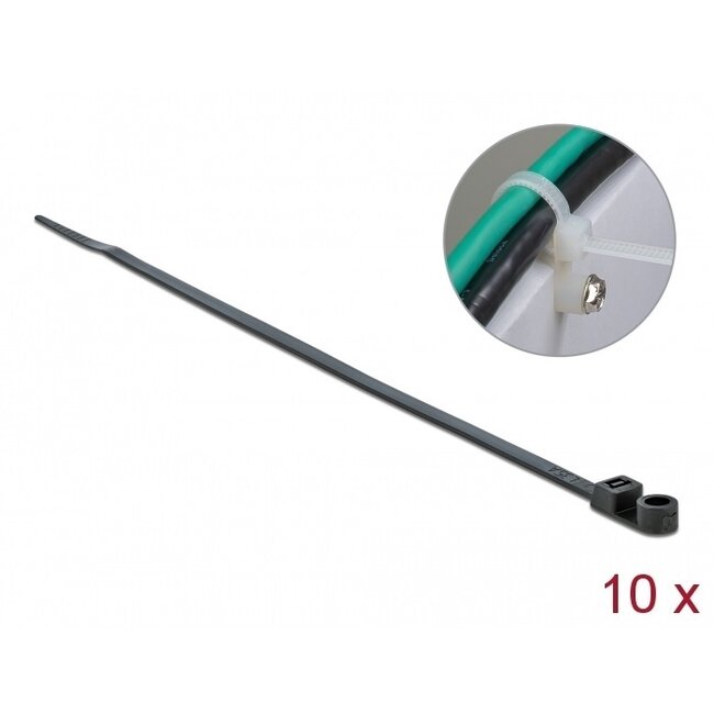 Wenn Sie Kabelbinder an einem Schreibtisch, Schrank oder Sockel verwenden, ist es ordentlich, wenn das zusammengebundene Kabelbündel an der richtigen Stelle bleibt. Mit diesen Kabelbindern mit Montageloch ist das einfach zu realisieren. Sie können den Kabelbinder einfach festschrauben, und das gebündelte Kabel bleibt genau dort, wo Sie die Schraube anbringen.
