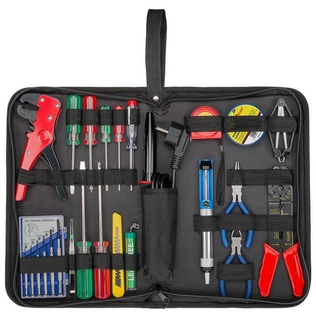 Komplettes Lötwerkzeug-Set, mit dem Sie alle Arten von Löt- und zugehörigen Arbeiten ausführen können. Das Set ist sehr umfangreich und wird in einer praktischen Aufbewahrungstasche geliefert.