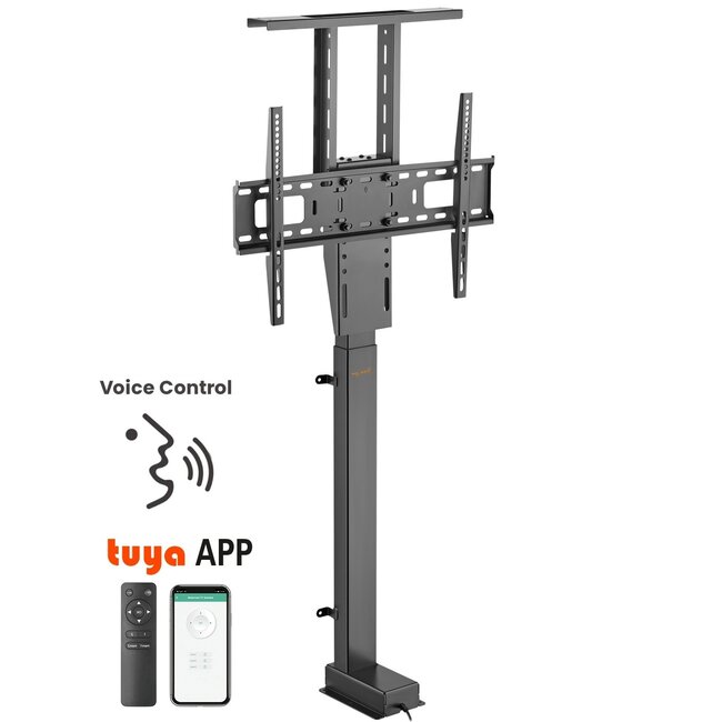 Universelle Hebevorrichtung für Flachbildfernseher und Monitore. Die Halterung besteht aus robusten und starken Materialien, mit denen Sie Ihren Bildschirm sicher in einem Möbelstück befestigen können. Mit dieser Möbelhalterung können Sie den Bildschirm aus Ihrem Möbel herausfahren und auch wieder zurück integrieren. Dank des integrierten Motors lässt sich die Halterung über die mitgelieferte Fernbedienung, die Tuya-App oder per Sprachsteuerung (Amazon Alexa oder Google Home) bedienen.