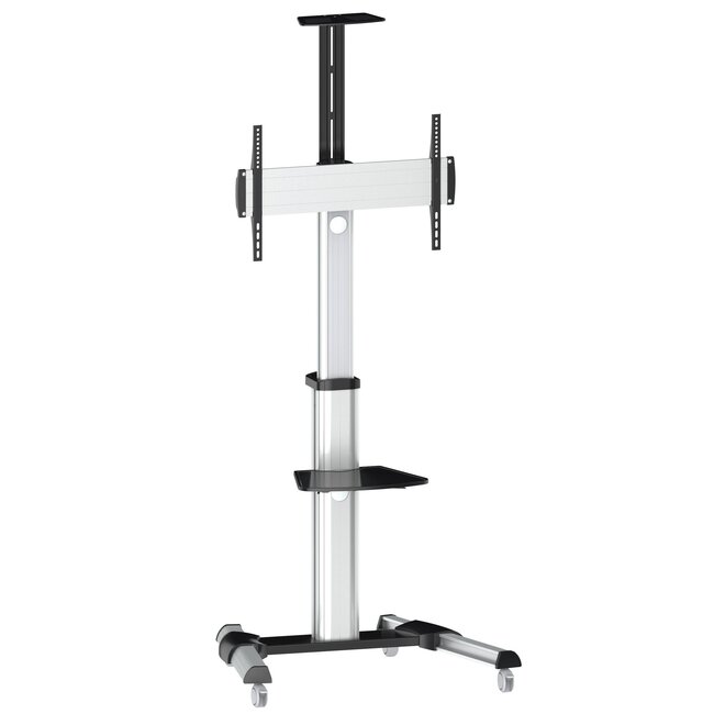 Professioneller fahrbarer Bodenständer für Flachbildfernseher und Monitore. Der Bodenständer besteht aus robusten und extrem starken Materialien, die für eine stabile und sichere Standfestigkeit sorgen und sich hervorragend für industrielle Umgebungen und/oder den professionellen Einsatz eignen. Dieser Bodenständer ist in der Höhe von 120 bis 160 cm verstellbar. Das ansprechende, robuste Design und die starken Rollen machen diesen Bodenständer ideal für Produktionsumgebungen, Büros, Präsentationen, Besprechungsräume, Geschäfte und Wartebereiche.