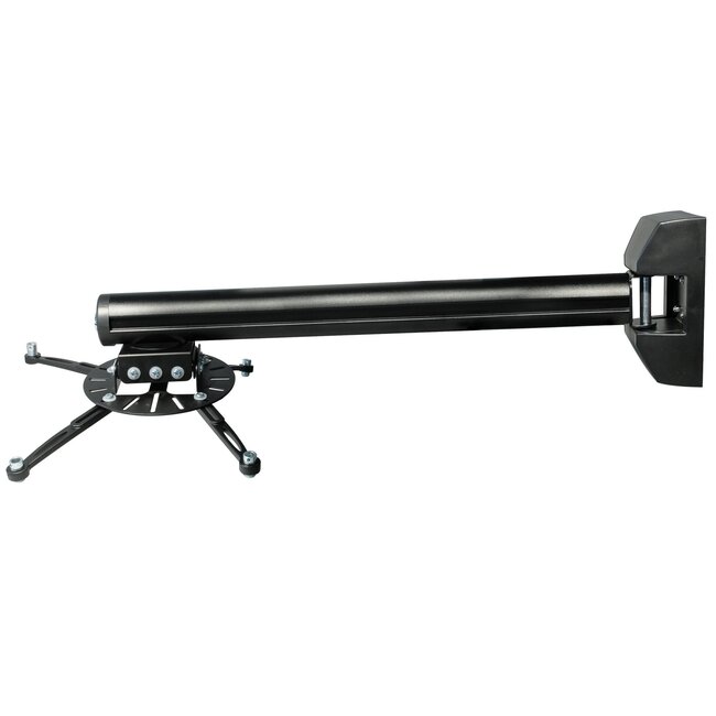 Universelle Wandhalterung für Beamer. Mit dieser Wandhalterung können Sie den Beamer drehen und neigen. Die Position des Projektors lässt sich dank der schwenkbaren Armkonstruktion einfach verändern. So können Sie den Beamer auch wegdrehen, wenn er nicht benutzt wird und im Weg hängt.