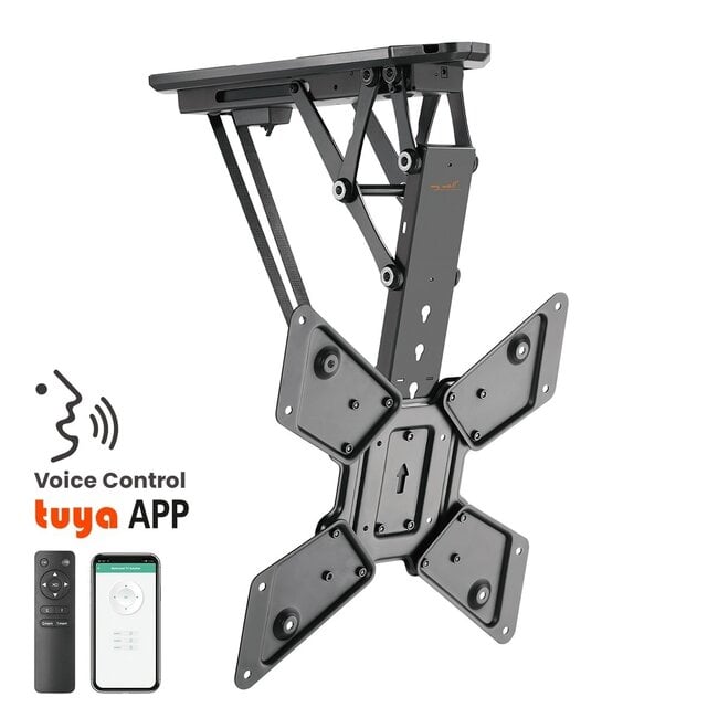 Universelle motorisierte Deckenhalterung für Flachbildfernseher und Monitore. Die Halterung besteht aus robusten und stabilen Materialien, mit denen Sie Ihr Display sicher an der Decke befestigen können. Mit dieser Halterung können Sie den Bildschirm ausklappen und wieder bündig an der Decke einklappen. Dank des integrierten Motors lässt sich die Halterung bequem über die mitgelieferte Fernbedienung, die Tuya-App oder per Sprachsteuerung (Amazon Alexa oder Google Home) bedienen.
