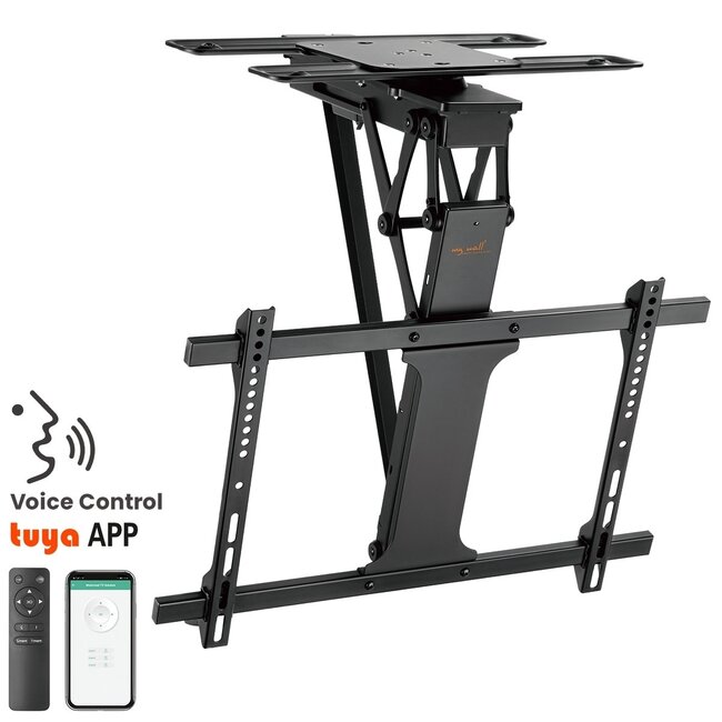 Universelle motorisierte Deckenhalterung für Flachbildfernseher und Monitore. Die Halterung besteht aus robusten und stabilen Materialien, mit denen Sie Ihren Bildschirm sicher an der Decke befestigen können. Mit dieser Halterung können Sie den Bildschirm ausklappen und auch wieder bündig an die Decke einklappen. Dank des integrierten Motors lässt sich die Halterung über die mitgelieferte Fernbedienung, die Tuya-App oder per Sprachsteuerung (Amazon Alexa oder Google Home) bedienen.