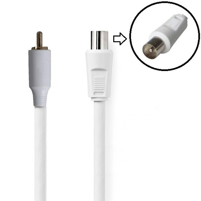 Das Bild zeigt ein komplettes Kabel von RCA auf Koax. Sie erhalten jedoch ein Koax-Kabel mit einem daran befestigten Adapter von Koax auf RCA. Dies hat keine Auswirkungen auf Qualität und Funktion.