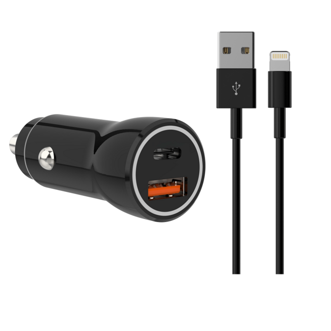 Verwenden Sie dieses universelle USB-Ladegerät, um Ihre tragbaren Geräte über die USB Typ C- und USB Typ A-Anschlüsse aufzuladen. Mit dem mitgelieferten Kabel können Sie Ihren Apple iPod, iPhone oder iPad mit 8-poligem Lightning-Anschluss verbinden.
