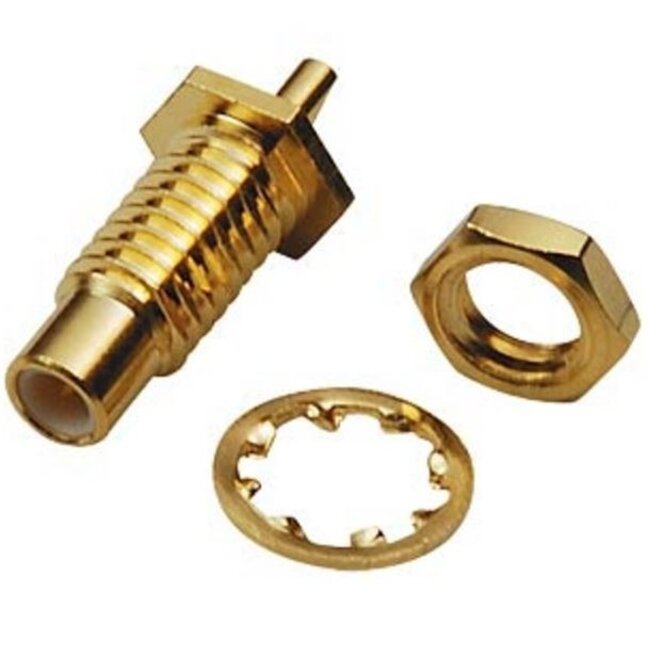Verwenden Sie diesen 50-Ohm-Einbau-Steckverbinder, um eine SMC-Verbindung in einem Panel herzustellen. Der Steckverbinder kann an ein Koaxialkabel gelötet werden. Installation von der Vorderseite.